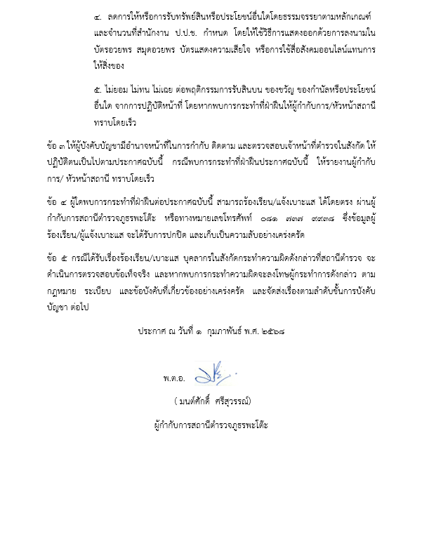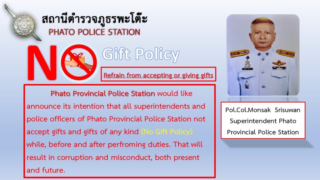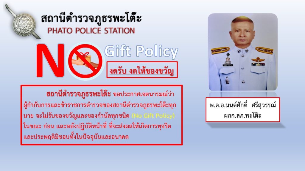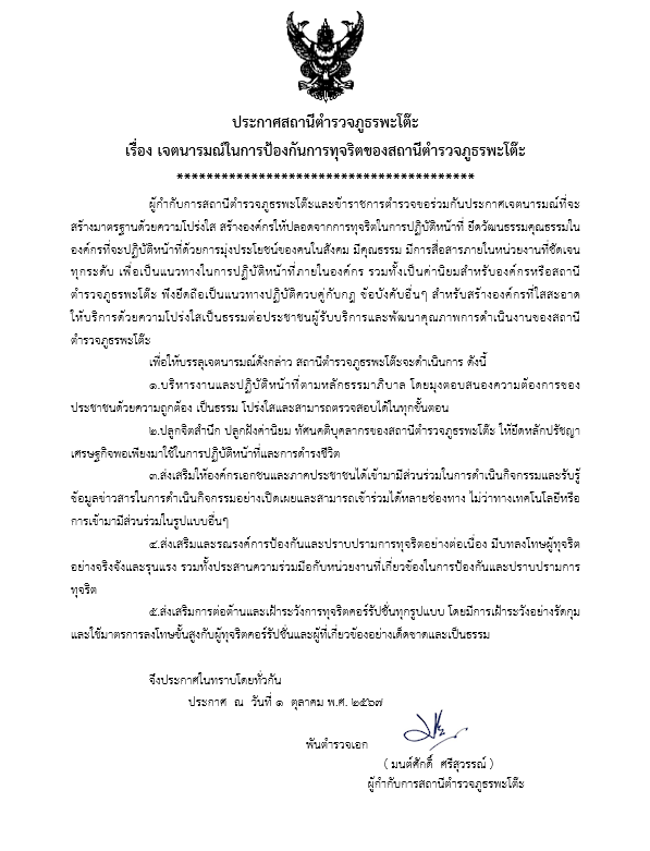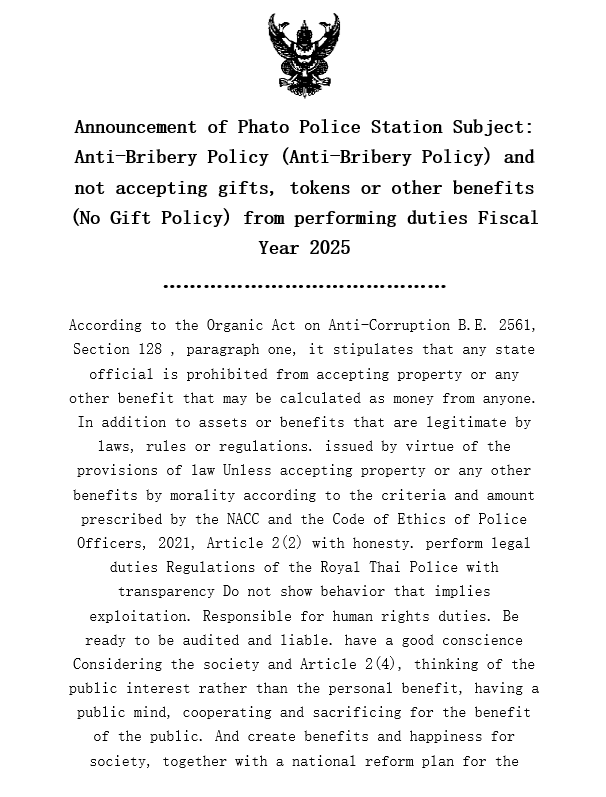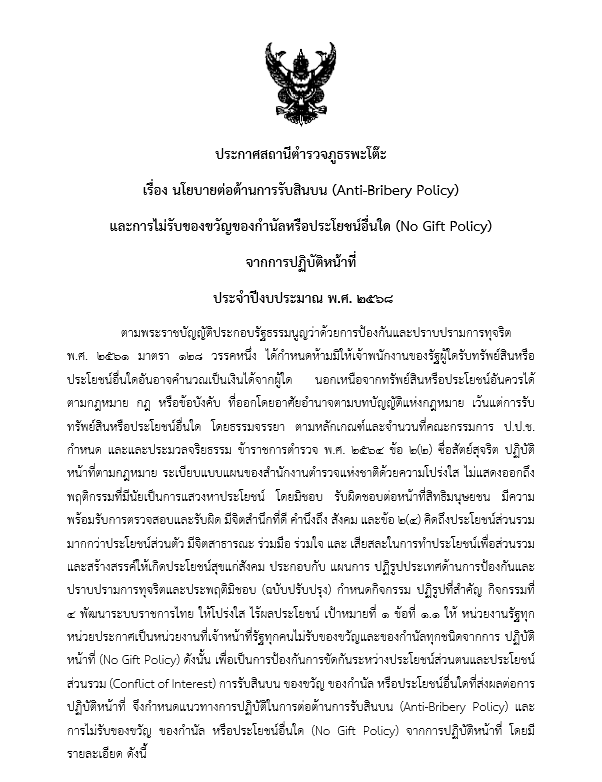 O18 ประกาศนโยบายต่อต้านการรับสินบน (Anti-Bribery Policy) และนโยบายไม่รับของขวัญและของกำนัลทุกชนิด (No Gift Policy) จากการปฏิบัติหน้าที่ 31 พ.ค.,2023 adminphatoใส่ความเห็น ประกาศนโยบายต่อต้านการรับสินบน (Anti-Bribery Policy) ประกาศเจตนารมณ์ในการป้องกันการทุจริตของสถานีตำรวจภูธรพะโต๊ะ แสดงภาพการเผยแพร่ ณ จุดจุดบริการและประชาสัมพันธ์